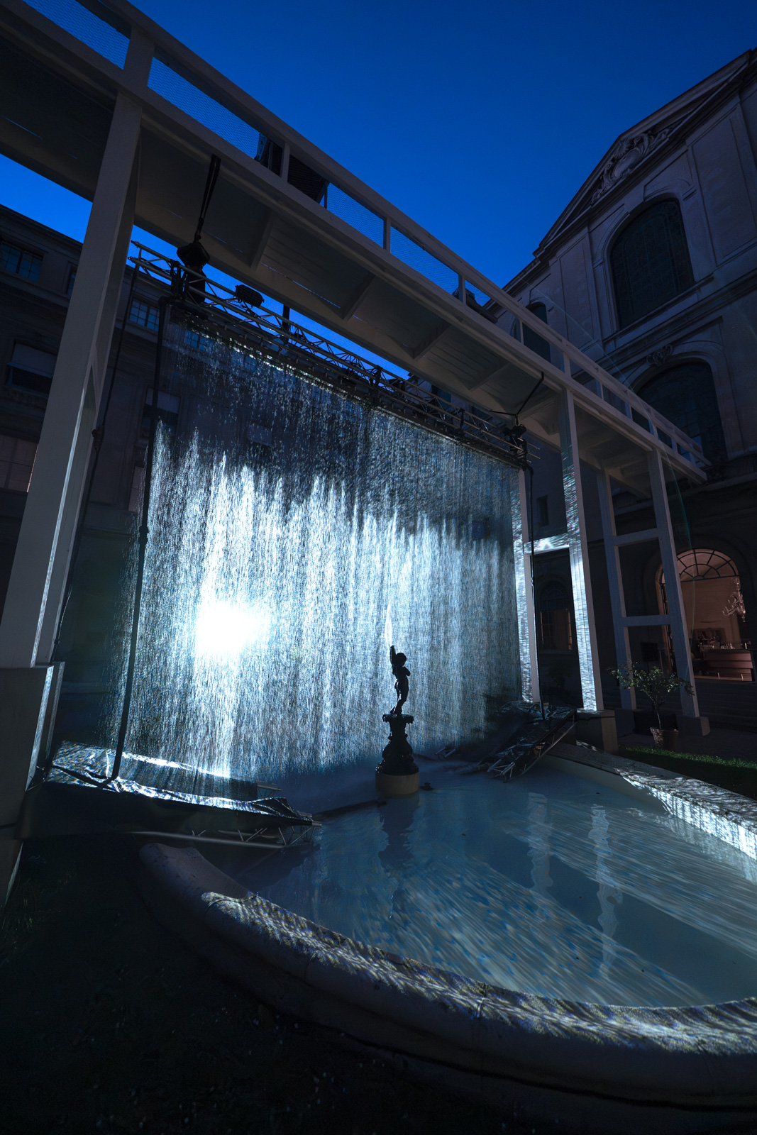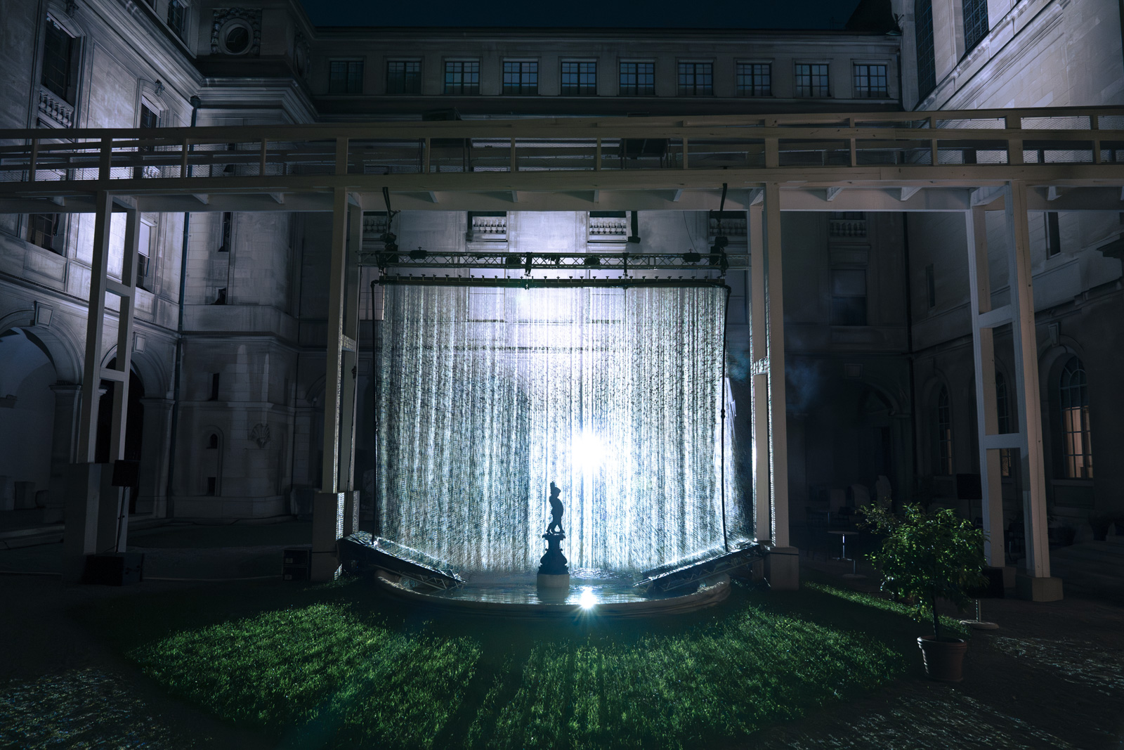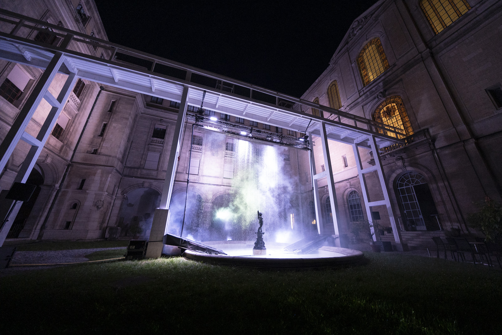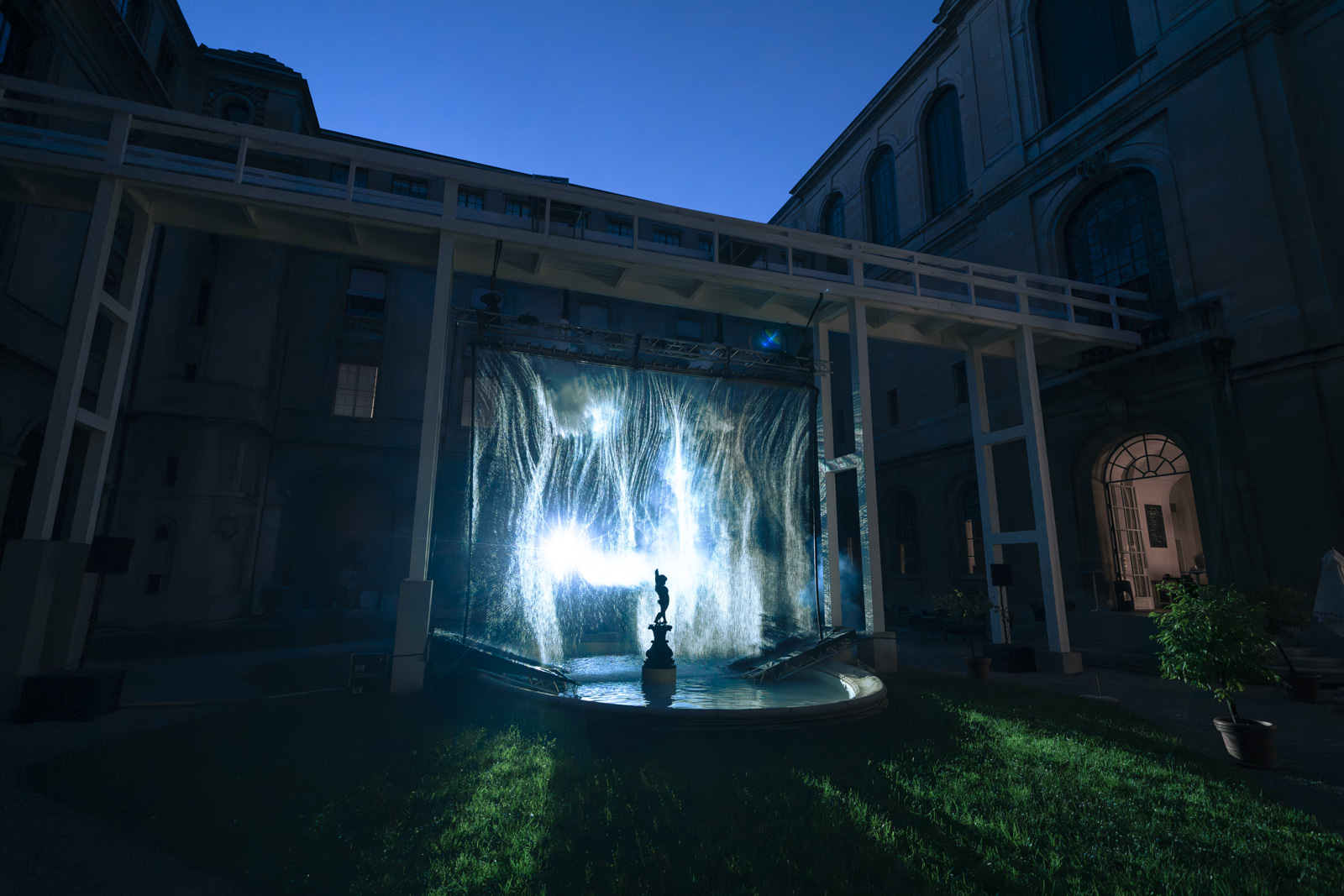Suspended beneath the bridge designed by Vincent Lamouroux, a monumental cascade of water, mist, and light becomes a temporary projection surface. Onto this shifting screen, we project LiDAR scans of historical objects selected by artist Carol Bove from the museum’s collection, as part of the exhibition La Genevoise.